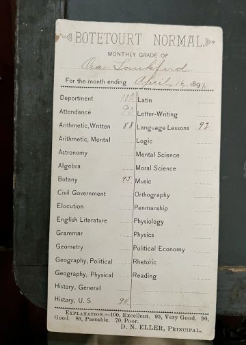This report card, dated April 16, 1897, for Miss Ora Lankford gives a glimpse into some of the classes taught at Botetourt Normal. Miss Lankford scored high in botany and deportment, as well as U.S. History and language!